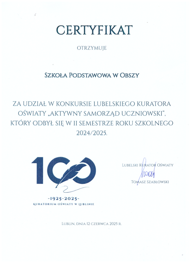 Gratulacje dla całej społeczności szkolnej! Otrzymaliśmy certyfikat od Lubelskiego Kuratora Oświaty!”